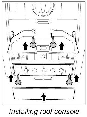 3. Fold up roof console, clip it in the roof liner and screw down using the four fastening screws. Close the glasses compartment and clip in the light unit cover.