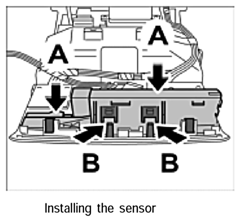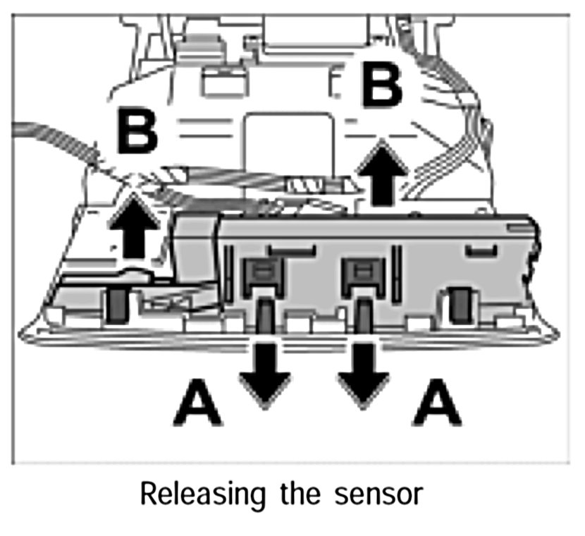 1. Insert sensor into roof console frame -arrows A- until the locking lugs -arrows B- are felt to engage. Ensure it is seated properly.