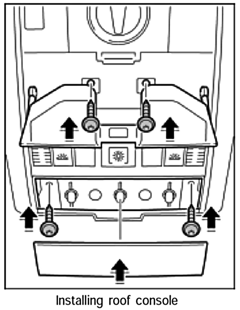 3. Fold up roof console, clip it in the roof liner and screw down using the four fastening screws. Close the glasses compartment and clip in the light unit cover.