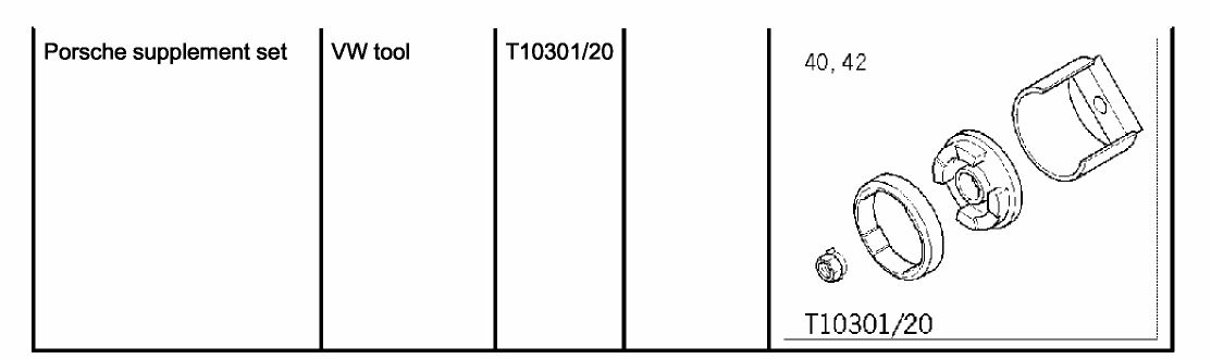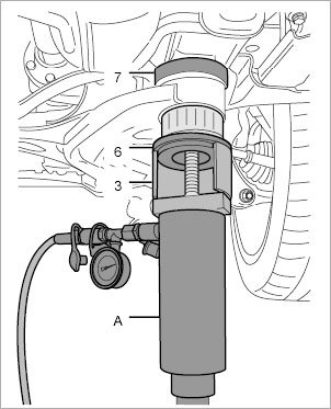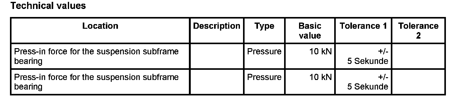 5. Press in suspension subframe bearing. To avoid damaging the bearing, the maximum -> Pressure: 10 kN±5 Sekunde must not be exceeded at the stop (10 KN = 350 bar). This conversion applies only to the hydraulic cylinder VAS 6178. The conversion depends on the [diameter] of the cylinder in question.