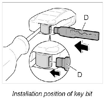 1. Use a new remote control and insert the key bit -arrow- at the correct installation position (groove).