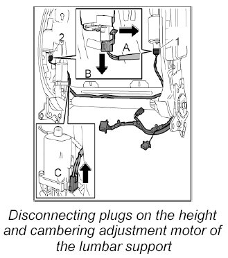 2. Pull off plug from the backrest adjustment motor -Arrow C-.