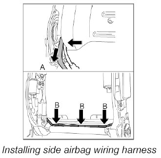 2. Clip wiring harness onto the backrest frame -Arrows B-.