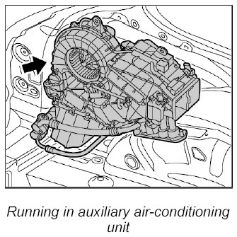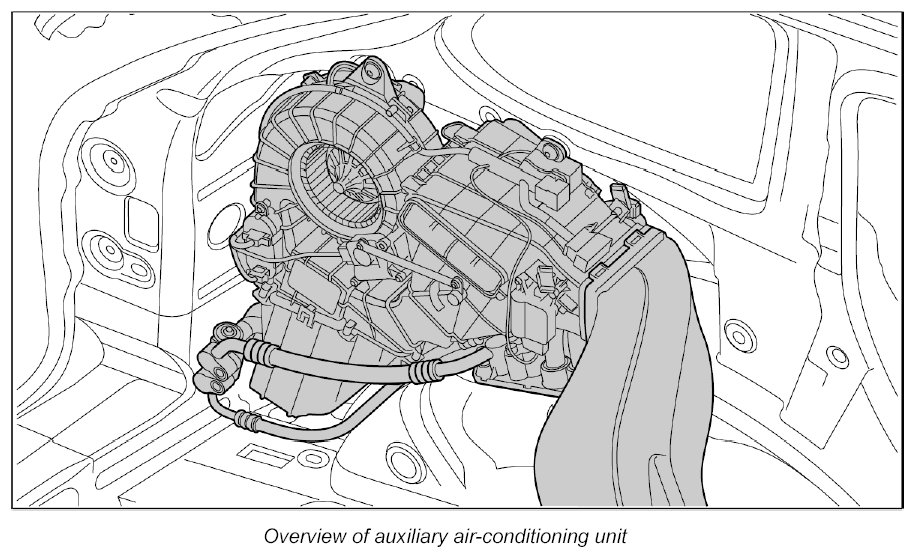 INFORMATION: For vehicles with four-zone air conditioning (2+2), the auxiliary air-conditioning unit is located behind the left rear side section cover for the auxiliary air-conditioning unit.