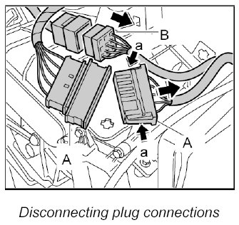3. Press the release on the electrical plug -A- -arrow a- and pull off plugs -A- and -B-.