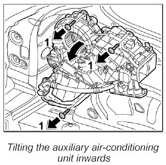 4. Unscrew the fastening screws -1- and tilt the auxiliary air-conditioning unit inwards on the top side.