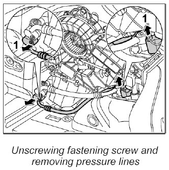 8. Unscrew the fastening screw for the pressure line in the upper bracket (not on the expansion valve at the bottom) -1-.