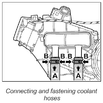 2. Push the coolant hoses onto the heat exchanger -arrows A- and attach with the spring-band clamps -B-.