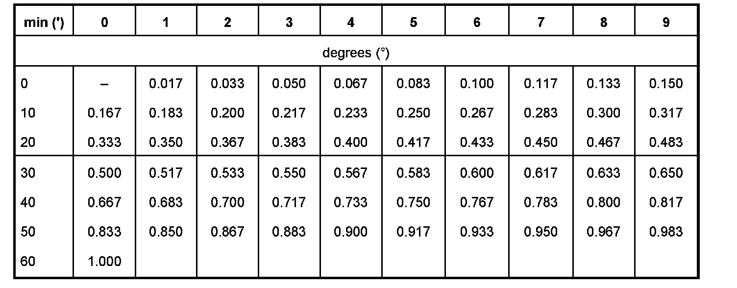 ^ Example 1: toe 17 min (17') = 0.283 decimal degrees according to table. Procedure for this: The imaginary line starting at the top of the 7-min column moving downwards and the line starting on the left in the 10-min row moving right meet at point/column 0.283.