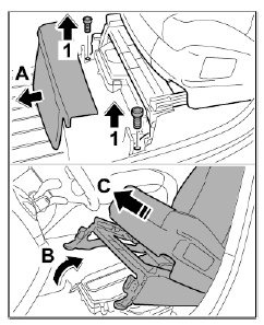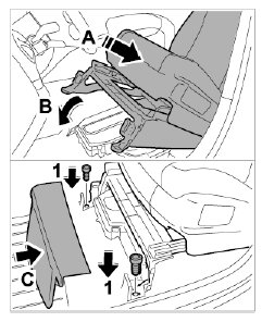 3. Fold the carpet sections forward and remove the two fastening screws -1-.