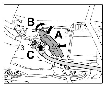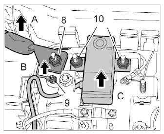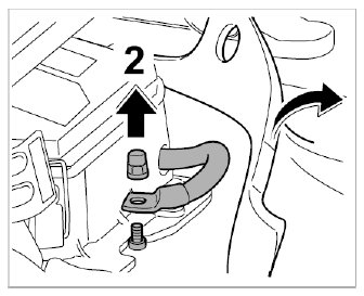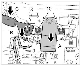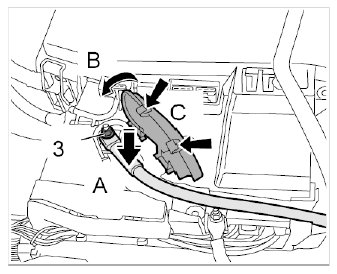 8. Unscrew fastening nut -3- and remove line for auxiliary battery -Arrow C-.
