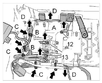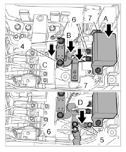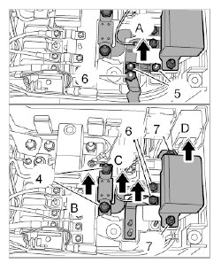 13. Undo fastening nuts -7- and remove charging relay -Arrow D-.