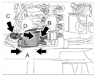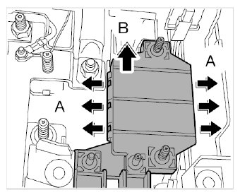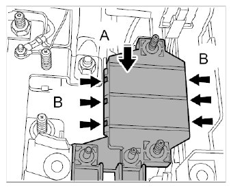 21. Push in cover of power distributor from front to back -Arrow A- and press on -Arrow B- until the latch engages.