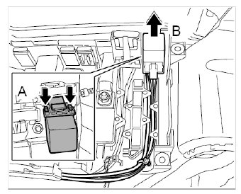 14. Release connector -Arrow A- and remove from charging relay -Arrow B-.