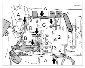 12. Undo fastening nuts -6- then remove line and contact bridges -Arrows C-.