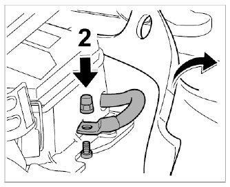 24. Fold up carpeting -arrow-, and place battery ground strap on body and tighten with fastening nut -2- - Tightening torque: 3.5 ftlb.