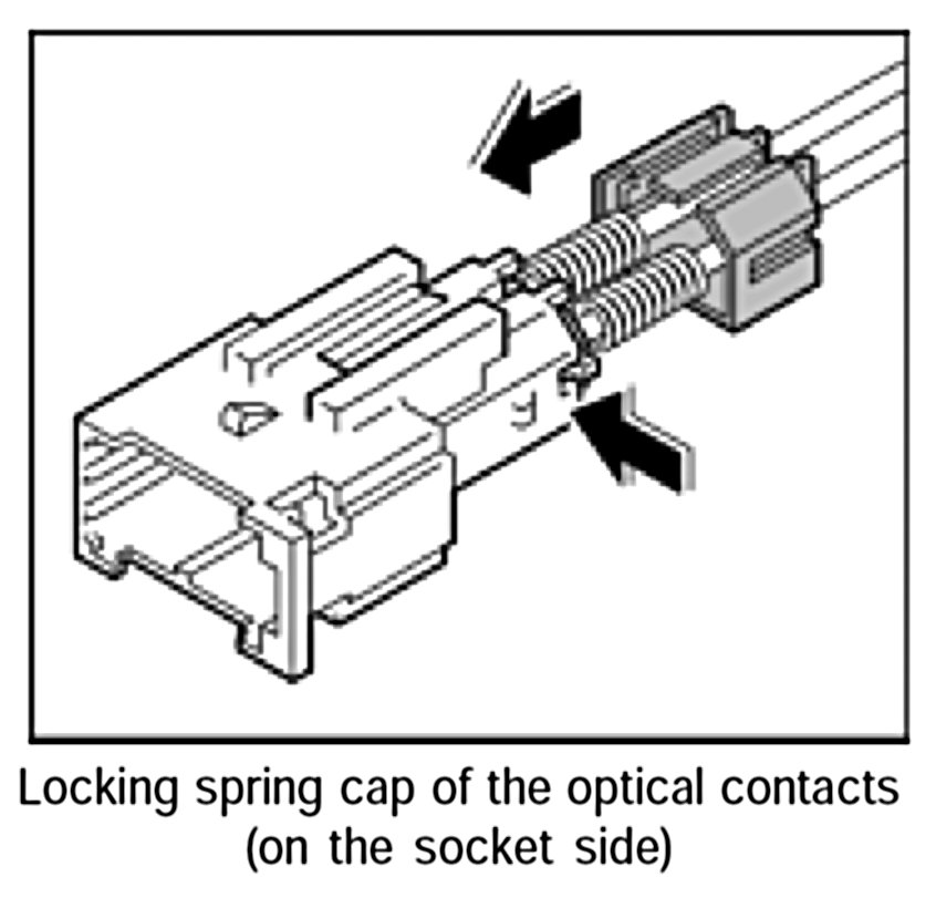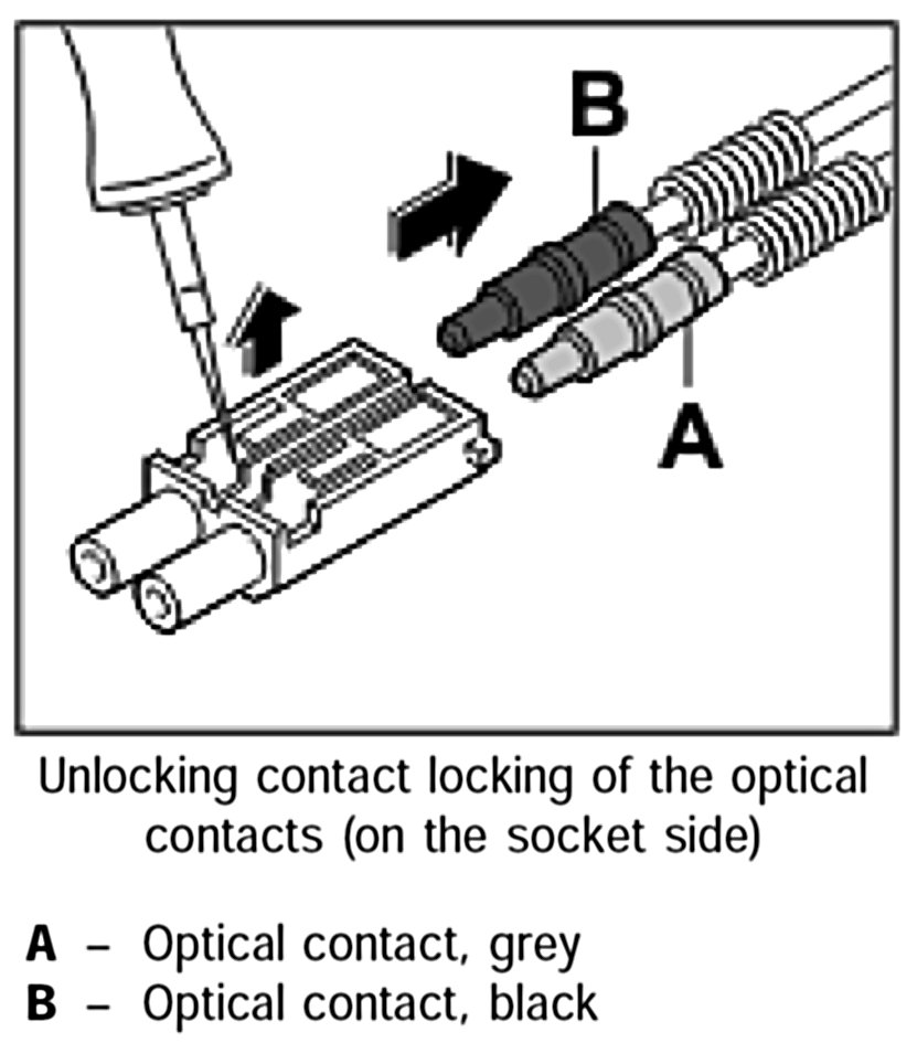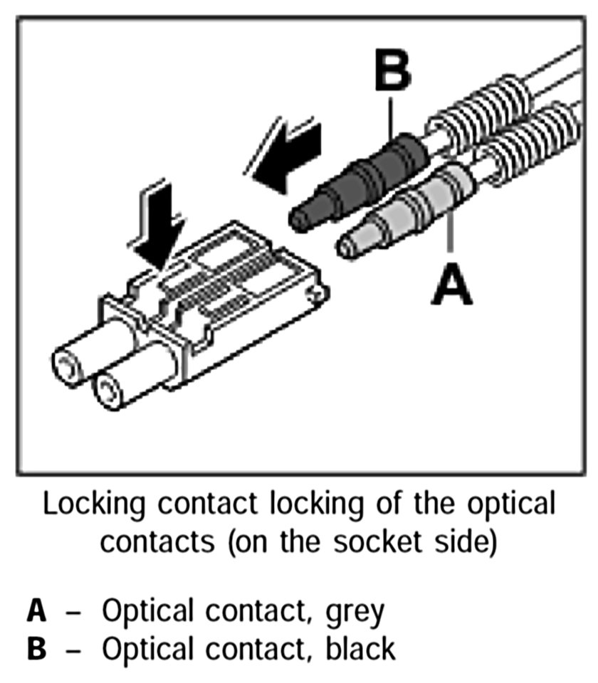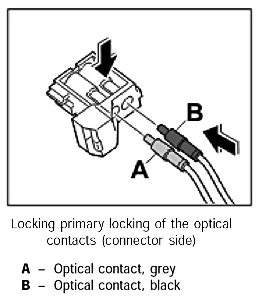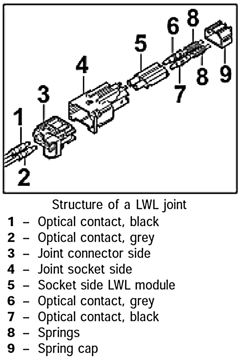 The LWL is delivered with affixed plastic contacts. These contacts are latched in the connector housing in the case of repairs. Grey and black contacts with identical mechanical dimensions are used.