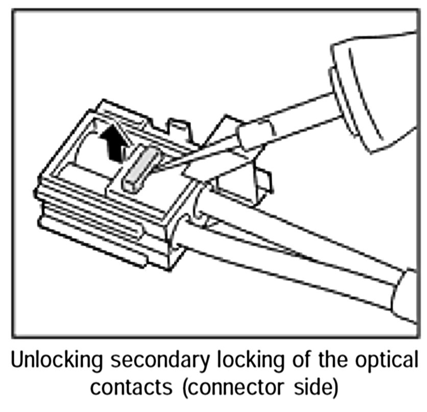 3. Position the press-out and unlocking tools for tab and round plug connectors of all sizes NR.155 for releasing on the contact locking mechanism of the LWL module and lift the locking mechanism.