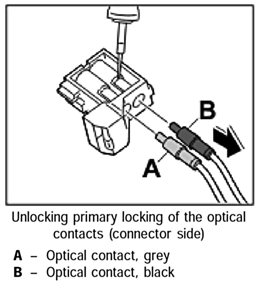 3. Carefully pull on the optical waveguide -A and B- in -direction of arrow-. If it is not possible to pull out the optical waveguide, check again if the secondary locking mechanism is completely released and if the primary locking mechanism is raised sufficiently.