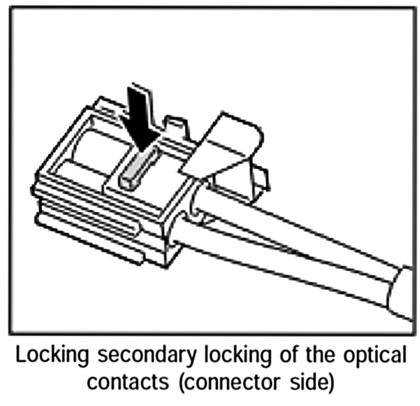 The LWL and the plug connections must not come into contact with fluids such as water, creeping compound, preservative, anti-freeze protection, cleaning agent. They will impair the MOST system function or cause complete system failure. Even plug connectors with plugged-in protective caps must not come into contact with the fluids listed.