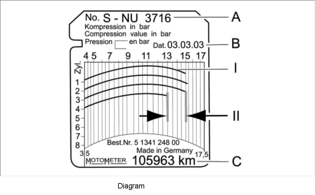2. Get a second person to press the starter. Testing of the cylinder is complete when the needle of the test device ceases to rise. Keep the accelerator pedal fully depressed during the test.