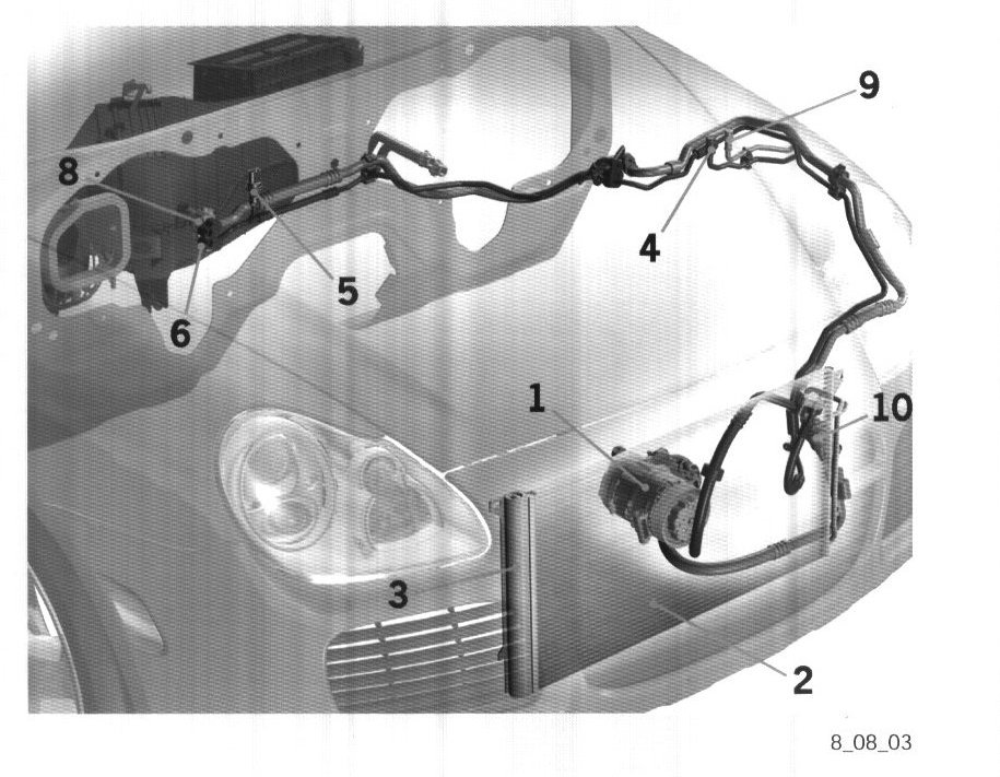 10. Pressure damper (low pressure side right in front of the compressor near the left wheel housing).