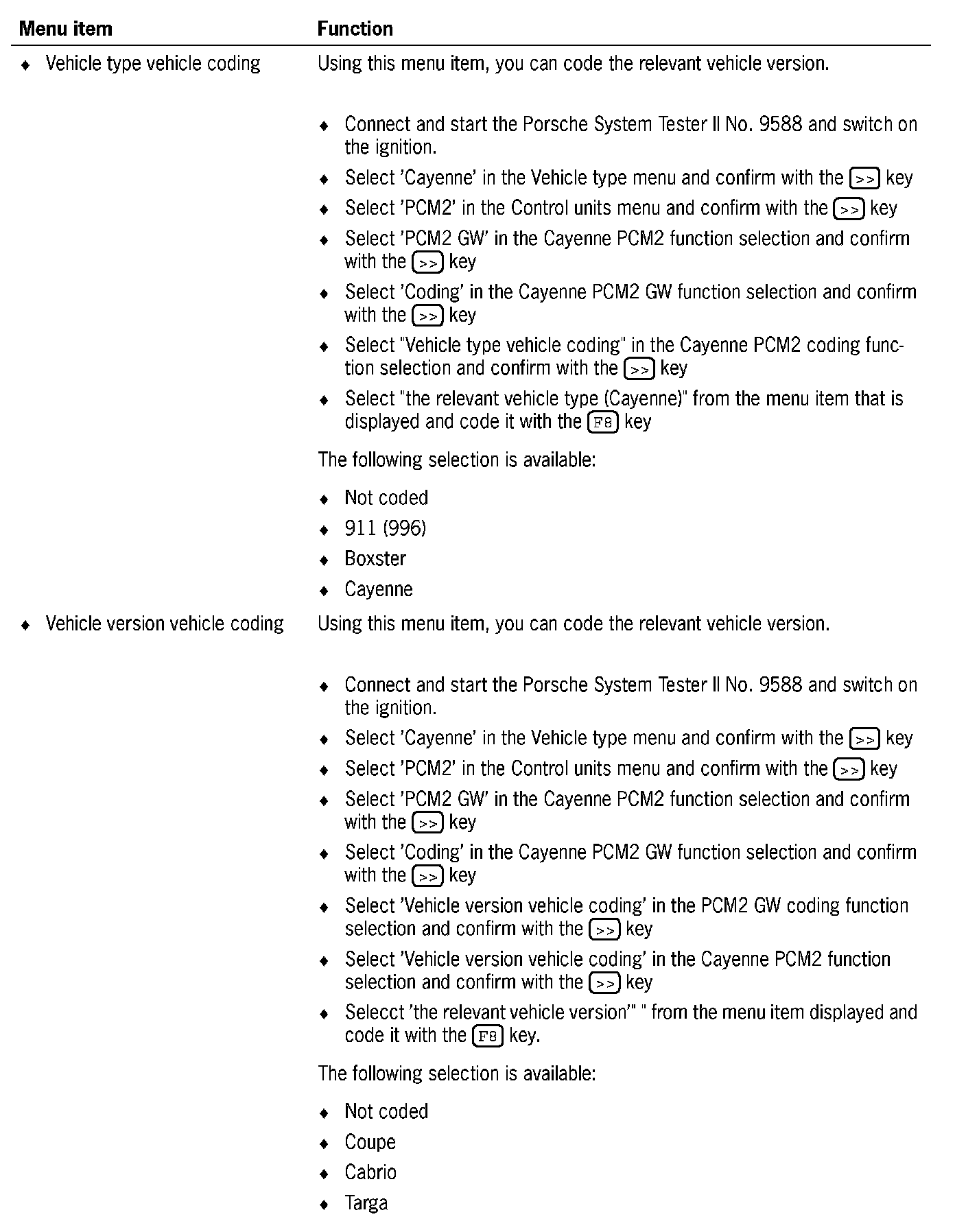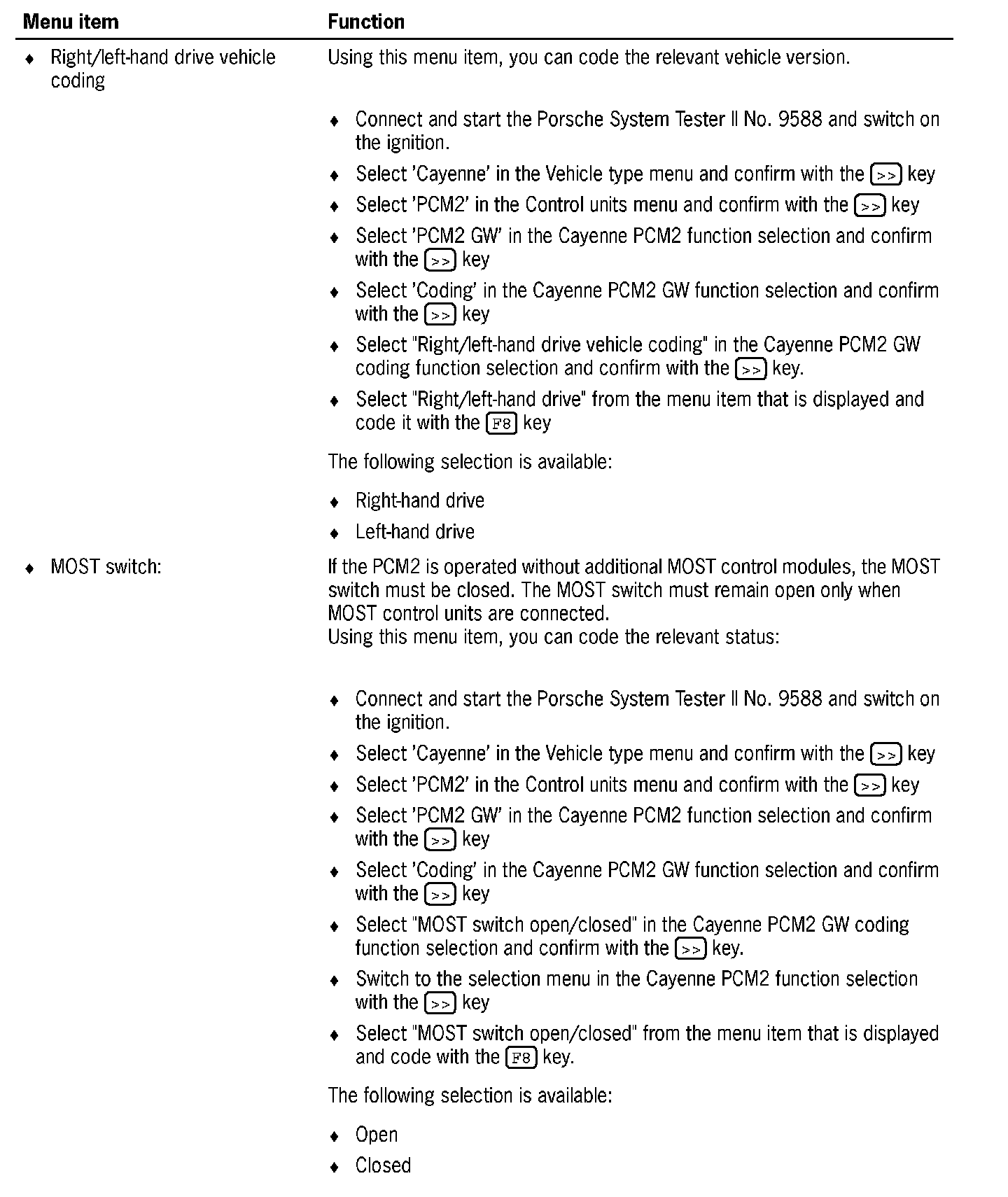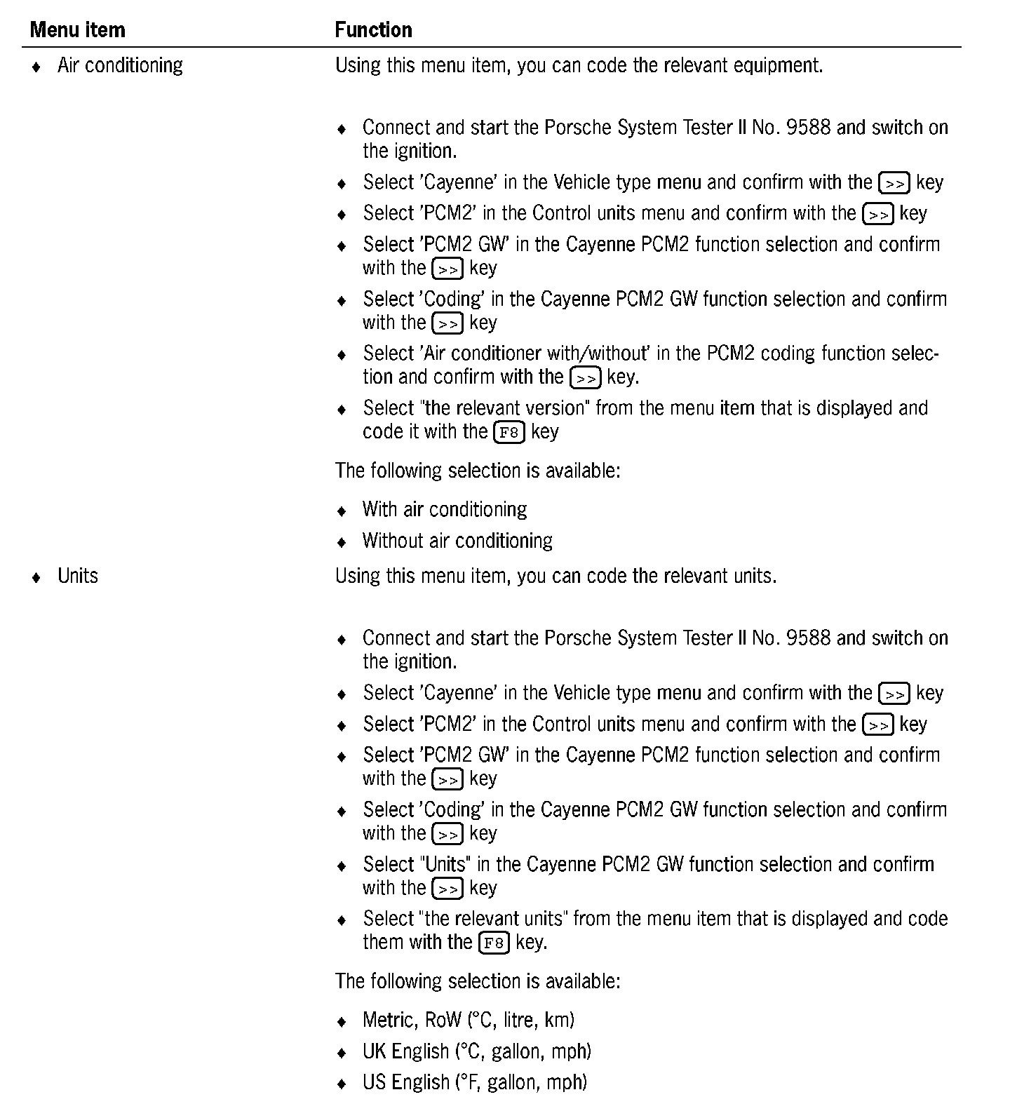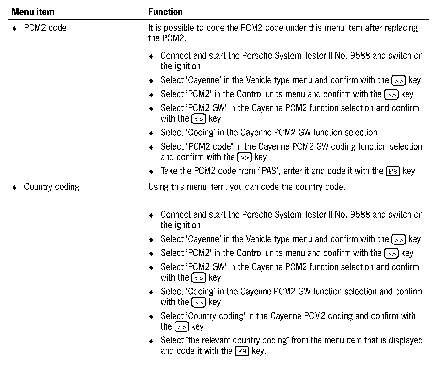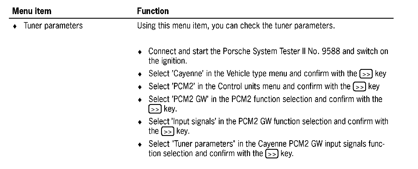 4. Select 'PCM2 GW' in the Cayenne PCM2 function selection and confirm with the [>>] key