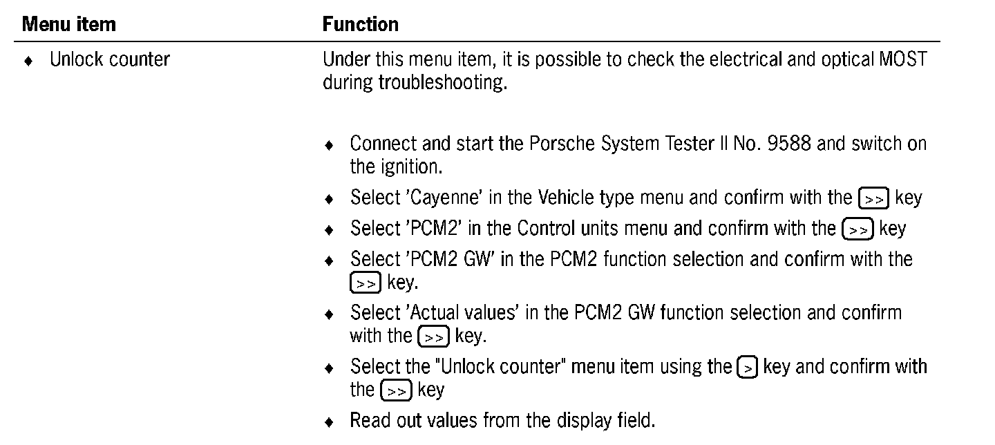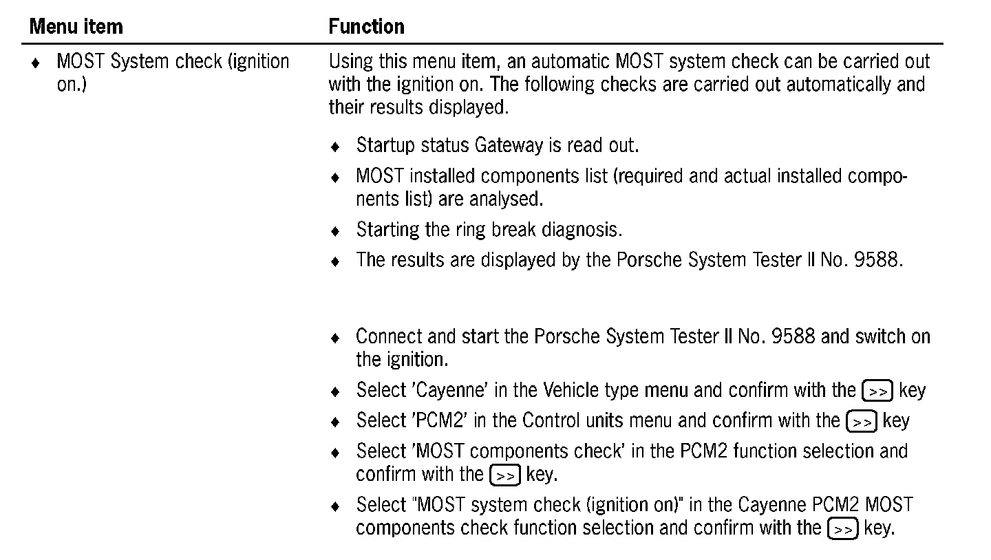 Communication between the Porsche System Tester II No. 9588 and the MOST control modules only takes place via the K lead to the instrument cluster. The data is transferred from the instrument cluster gateway to the MOST control modules via CAN Infotainment to the PCM2 gateway, via the electrical MOST in the PCM2 and via the optical MOST outside of the PCM2.