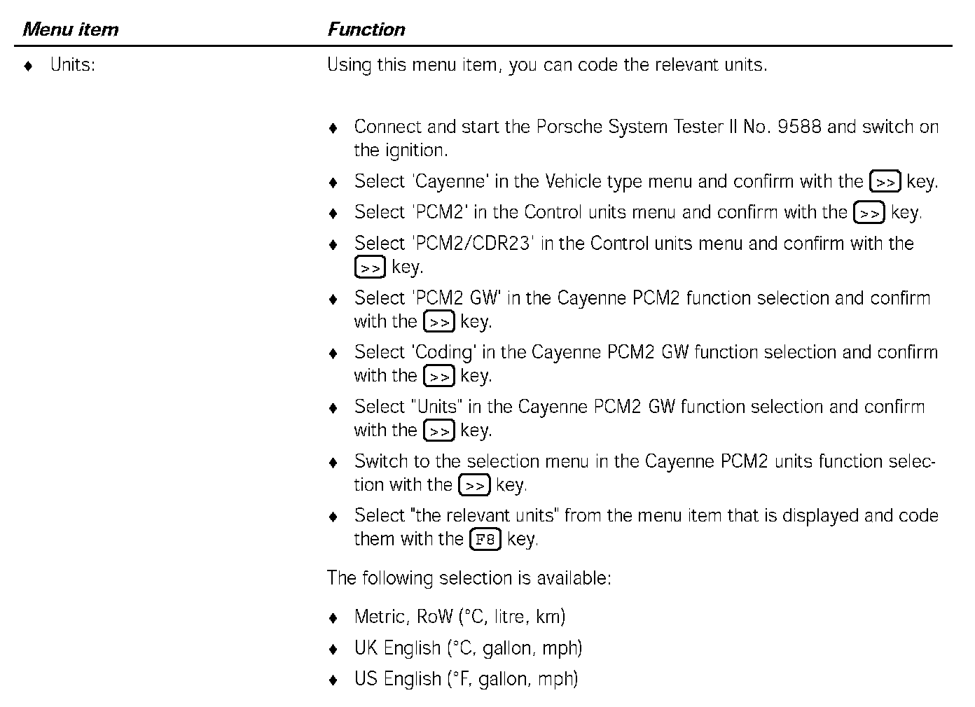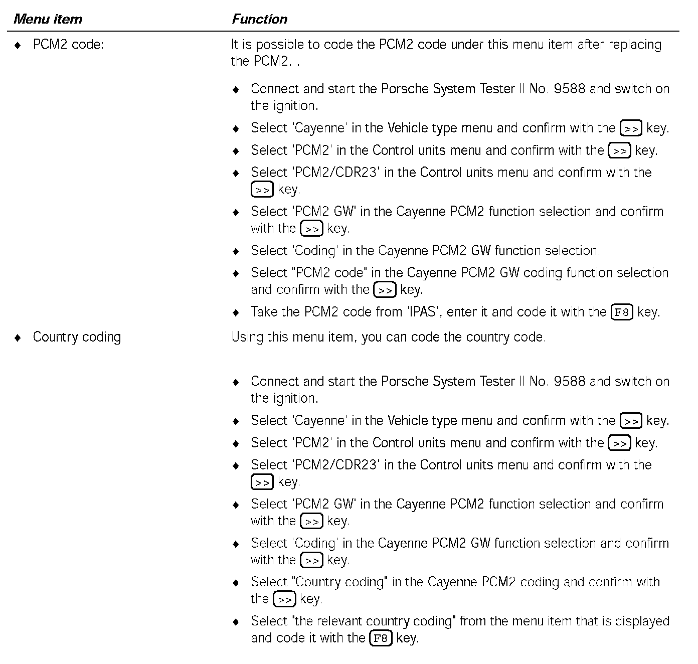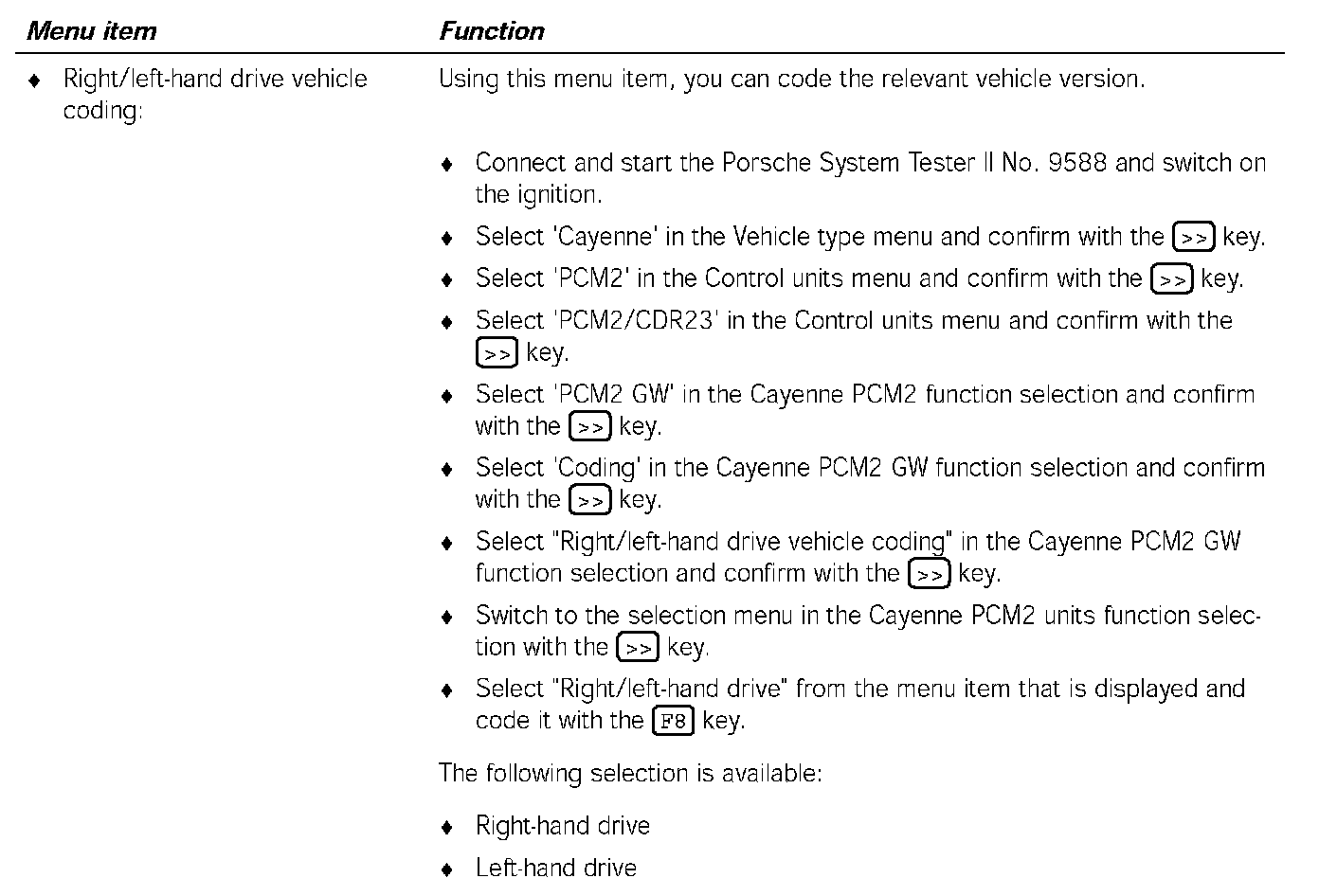 5. Select 'PCM2 GW' in the Cayenne PCM2/CDR23 function selection menu and confirm with the [>>] key.