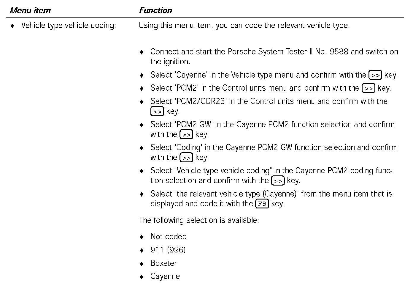 2. Select 'Cayenne' in the Vehicle type menu and confirm with the [-->|] key.