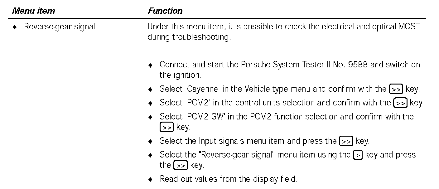 Communication between the Porsche System Tester II No. 9588 and the MOST control units only takes place via the K lead to the instrument cluster. The data is transferred from the instrument cluster gateway to the MOST control units, via CAN Comfort to the PCM2 gateway, via the electrical MOST in the PCM2 and via the optical MOST outside of the PCM2.