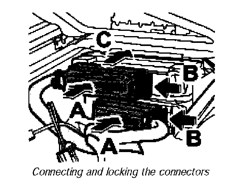 2. Connect the two connectors -A- and push in the locking mechanism -B- until it is felt to engage. Connecting and locking the connectors