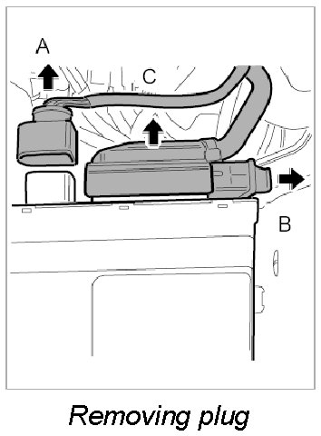 2. Press and pull off plug -arrow A-. Open lock -arrow B- on plug -arrow C- and remove plug.