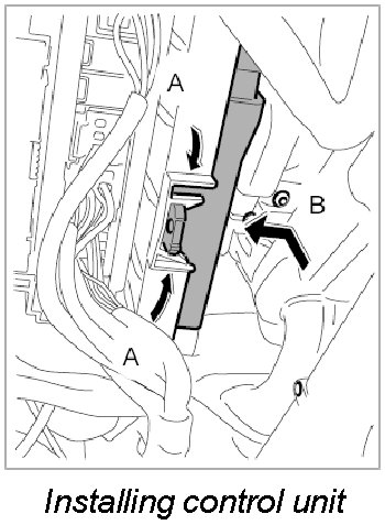 3. Insert control unit into the upper mounting point -arrow B- and engage in holder -arrows A-.