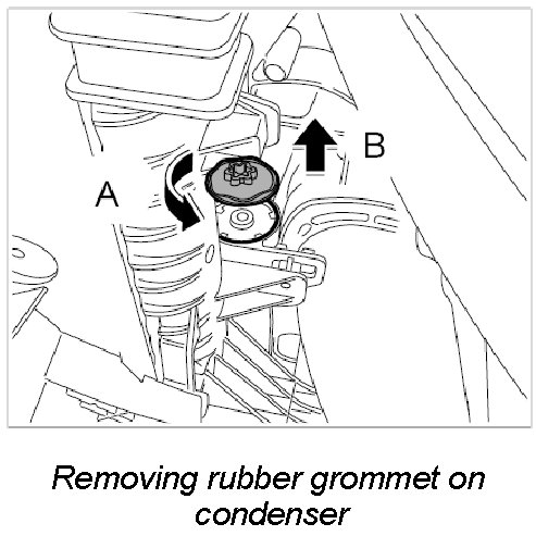 2. Unscrew rubber grommet on condenser -arrow A- and remove upwards -arrow B-.