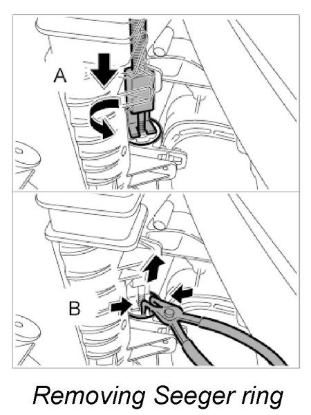 3. -A- Using a slide hammer kit NR.168, push plug down and turn Seeger ring until accessible from air filter.