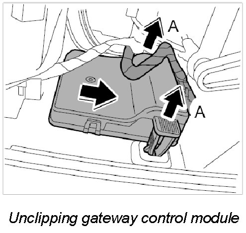 3. Unclip gateway control module on glove compartment -arrows A- and remove.