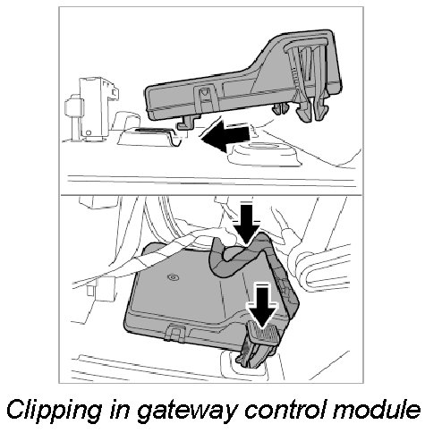 2. Insert the gateway control module with the guide pin in the guide on the glove compartment and clip in.