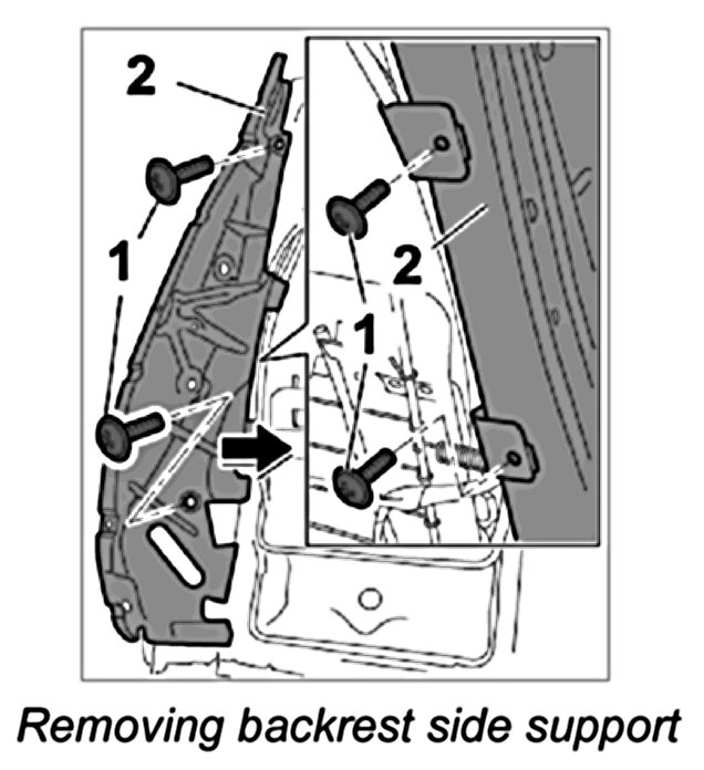 1. Unscrew the four fastening screws -1- and remove backrest side support -2-.