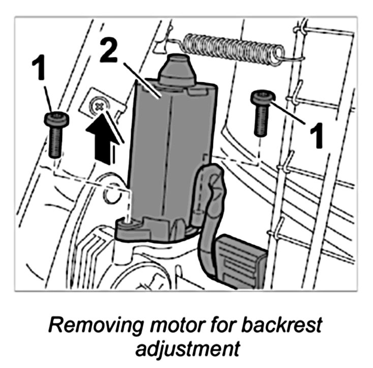 4. Unscrew the two fastening screws -1- and remove motor for backrest adjustment -2-.
