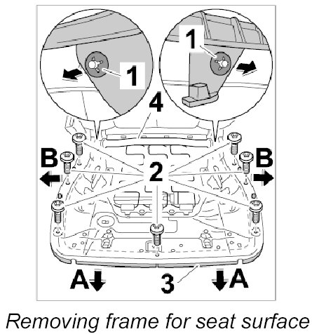 2. Unscrew fastening screws -2-, pull frame for seat surface -3- downwards -arrow A- and remove outwards -arrow B- from the seat frame -4-.