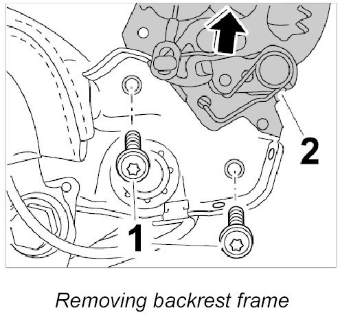 2. Unscrew fastening screws -1- on left and right and remove backrest frame -2- up out of the seat frame.