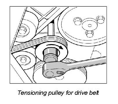 1. Slacken the drive belt. To do this, turn the tensioning roller clockwise using a ring wrench (a/f 24), remove the drive belt, check for damage and wear and replace if necessary.