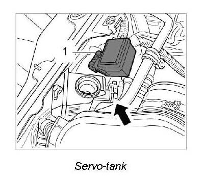 3. Release bayonet lock -arrow- on the power-steering reservoir and remove power-steering reservoir. Collect dripping Pentosin with a cloth.