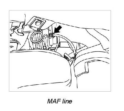 8. Unclip mass air flow sensor (MAF) line -arrow- from the air-cleaner box.