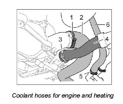 21. Loosen spring band clamps -1, 3, 5- and pull off coolant hoses -2, 4, 6-.