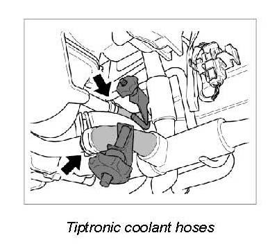 22. Tiptronic: Disconnect coolant hoses from oil-water heat exchanger (transmission), loosen spring band clamps and pull off hoses.