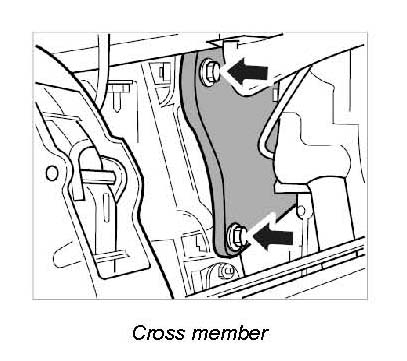 31. Unscrew cross-member screws (M10 x 45) -arrows- and remove cross member. Pay attention to the bracket for the headlight beam adjustment (if present).