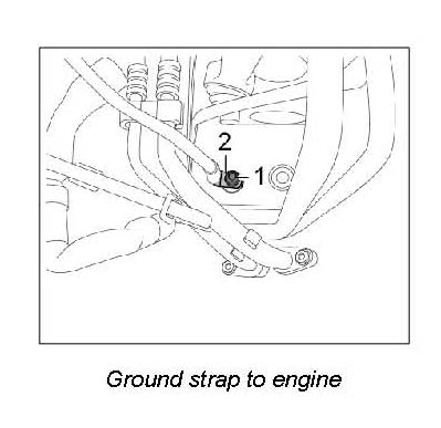 33. Unscrew nut (M8) -1- and remove ground strap -2- (right side of vehicle).