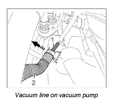 35. Release vacuum line -2- on vacuum pump for brake booster and pull off. Then pull off the small vacuum line -1-.